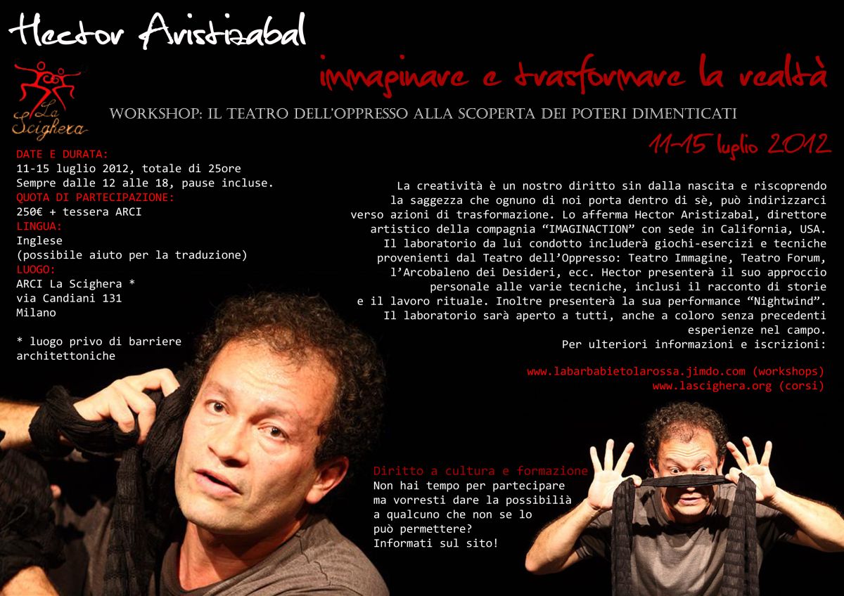 Dall’11 al 15 luglio 2012, a Milano, si terrà lo stage “Immaginare e Trasformare la Realtà“, con il terapeuta, scrittore, attivista e conduttore colombiano Hector Aristizabal. Un laboratorio per conoscere o approfondire la conoscenza delle tecniche del Teatro dell’Oppresso, uno spazio di incontro, condivisione e domande per tutti che usano le tecniche del Teatro dell’Oppresso, un’occasione per scoprire approcci diversi come il racconto di storie o il lavoro rituale.